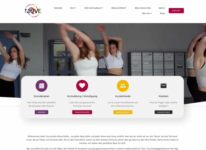 Das Tanzstudio Move in Mollis bietet ein vielfältiges Kursangebot für Kinder, Jugendliche und Erwachsene. Trotz hoher Qualität im Unterricht fehlte es an einer modernen, professionellen Website und an digitaler Sichtbarkeit. Die bisherige Onlinepräsenz war veraltet, nicht mobiloptimiert und bei Google kaum auffindbar. Auch eine klare Struktur zur Kursanmeldung oder Übersicht über das Angebot war für Interessierte nicht gegeben.